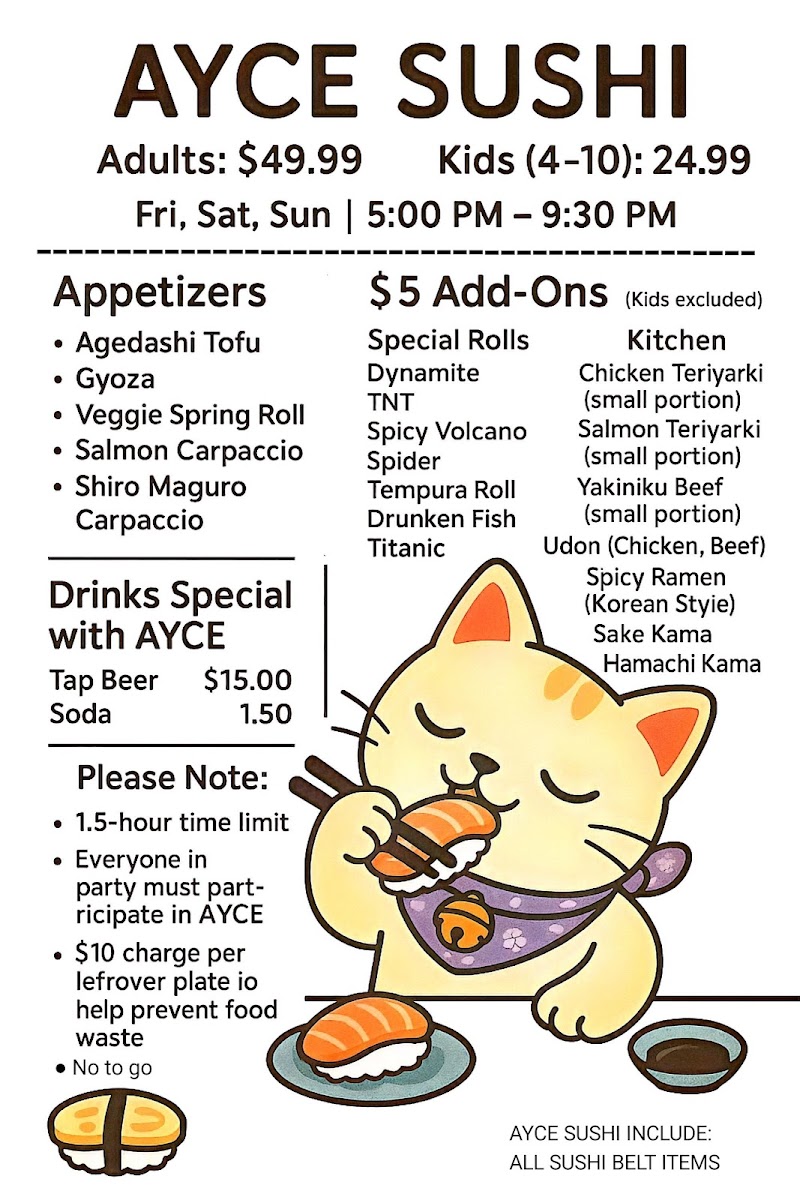 156pcs + Kinchen Food. 3 Kappa Maki, 3 Tekka Maki, 3 California Roll, 3 Spicy Tuna Roll,3 New York Roll, 3 Rock & Roll, 2 Rainbow Roll, 2 Shrek Roll, 2_49ers Roll + Edamame + Large Rice. 20pccs Gyoza, 20pcs Coconut Shrimp, 20pcs Veggie Spring Roll...