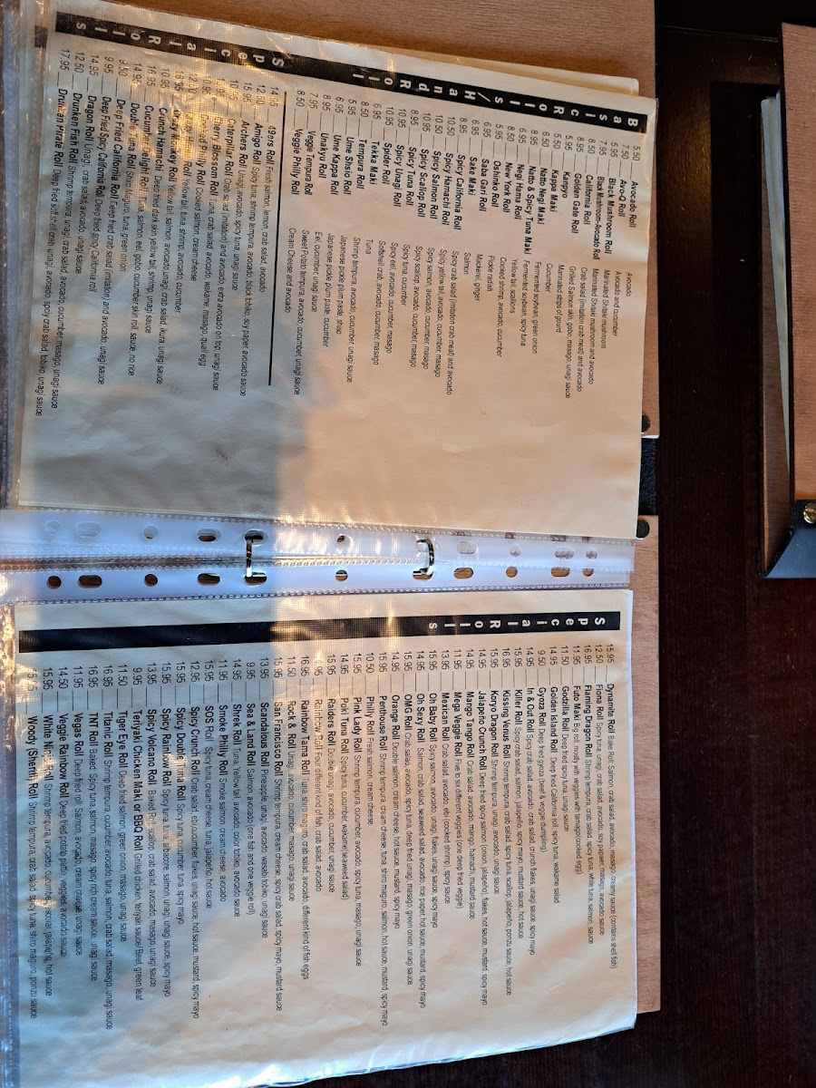 Shrimp Tempura, Avocado, Cucumber, Escolar, Jalapeno, hot sauce