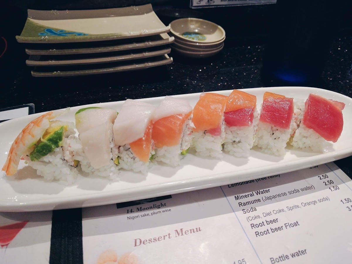 Tuna, yellow tail, avocado, colored tobiko, avocado sauce